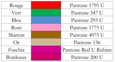 A noter que les couleurs de personnalisation sont prédéfinies dans notre nuancier et sont en pantone, les voici ci-dessous :